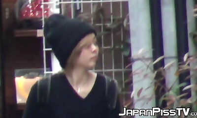 Japanese lovelies flash hairy pussies during public peeing